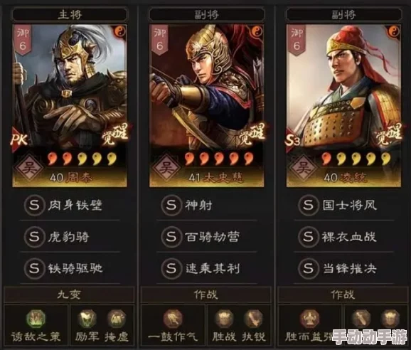 3、周泰:作为队伍的肉盾和辅助,周泰的虎豹骑能够提升队伍的整体速度,使队伍在战斗中占据先手优势,铁骑驱驰则能够进一步增加队伍的突击能力,提高甘宁和太史慈的输出效率,周泰的兵书可以选择守而有道、守势、防备,以提升其防御能力。